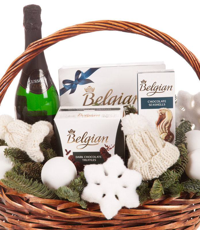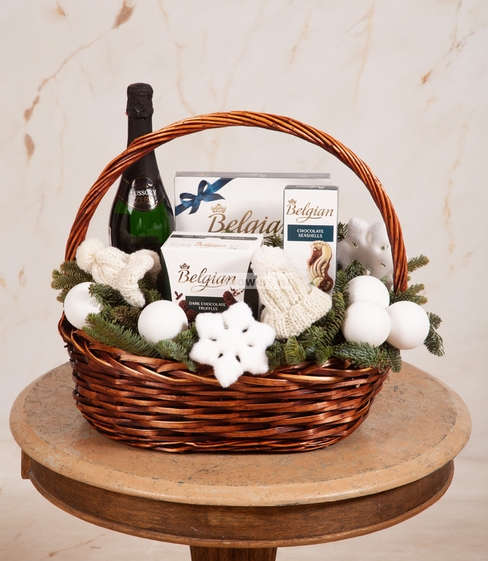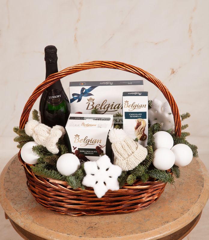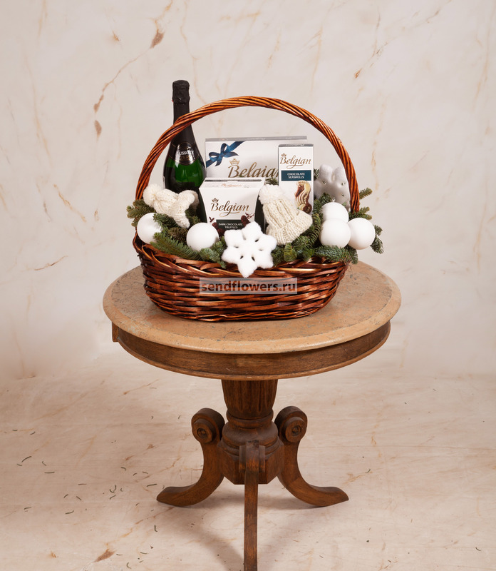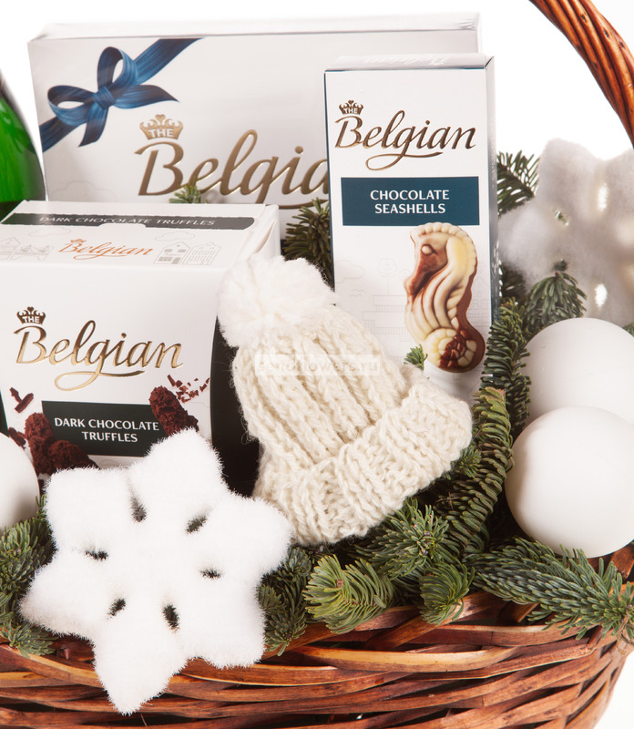 Состав: Корзина средняя (1), Оазис кирпич (4), Лапник (3), Лента натуральная (5), Шар новогодний стандартный (пластик) (5), Бельжиан "Дары моря" синий бант 250гр (1), Бельгийский трюфель Belgian с солёной карамелью 200гр (1), Вязаная шапка (2), Украшение ёлочное "Сахарное" (2), belgian Дары Моря синий бант 65гр. (1), Вино игристое безалкогольное белое, 0,75 л (1)