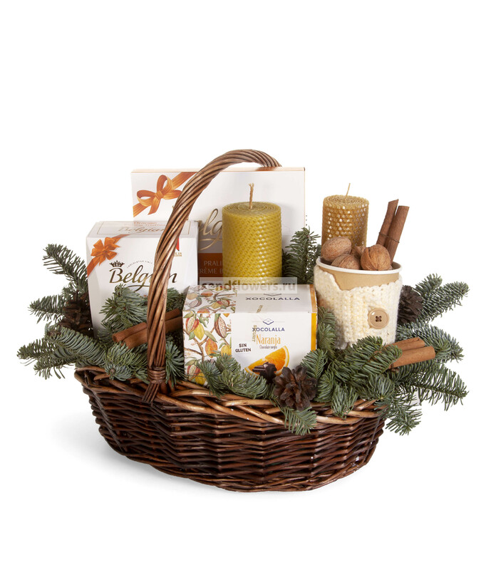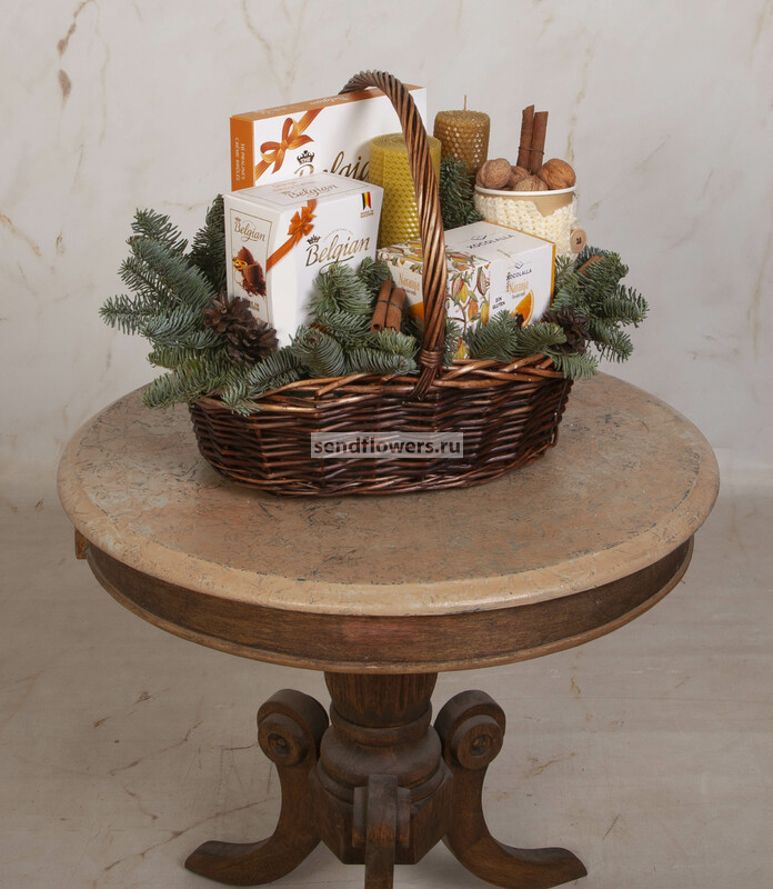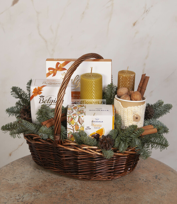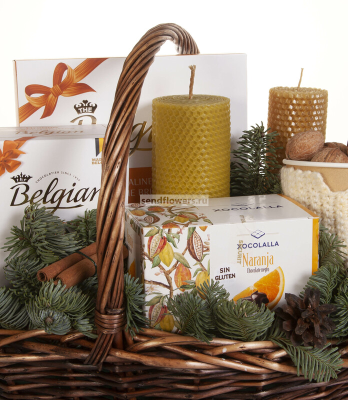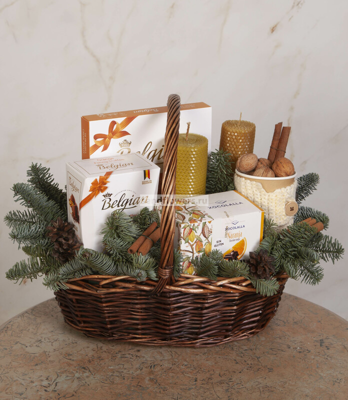 Состав: Корзина средняя (1), Оазис кирпич (4), Лапник (2), Лента натуральная (5), Шишка натуральная (7), Корица (6), Грецкий орех (15), Бельгийский трюфель Belgian с кусочками апельсинов 200г (1), Стакан бумажный для кофе "Coffe time" (1), Вязанный чехол (1), Пуговица костюмная (1), Медовая свеча большая (1), Медовая свеча средняя (1), Шоколадные конфеты The Belgian крем брюле 200гр (1), Дольки апельсина в шоколаде 150г (CHOCONARANJA GRANEL) (1)
