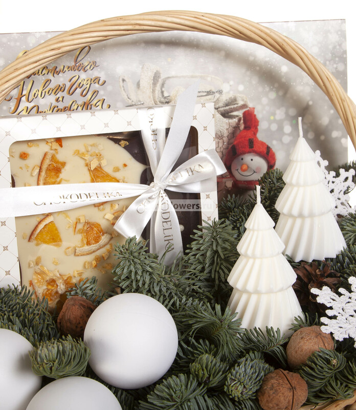 Состав: Оазис кирпич (6), Лапник (4), Лента натуральная (5), Шар новогодний стандартный (пластик) (7), Шишка натуральная (10), Корзина большая (1), Грецкий орех (10), Вязаные снежинки (2), Шоколад темный с украшением "Шоколадный дуэт", 200 гр (1), Декоративная свеча "Ёлочка" (2), Конфеты ШОКОЛЕДИ "Трюфельный крем" (СНЕГОВИКИ) 150 (1)