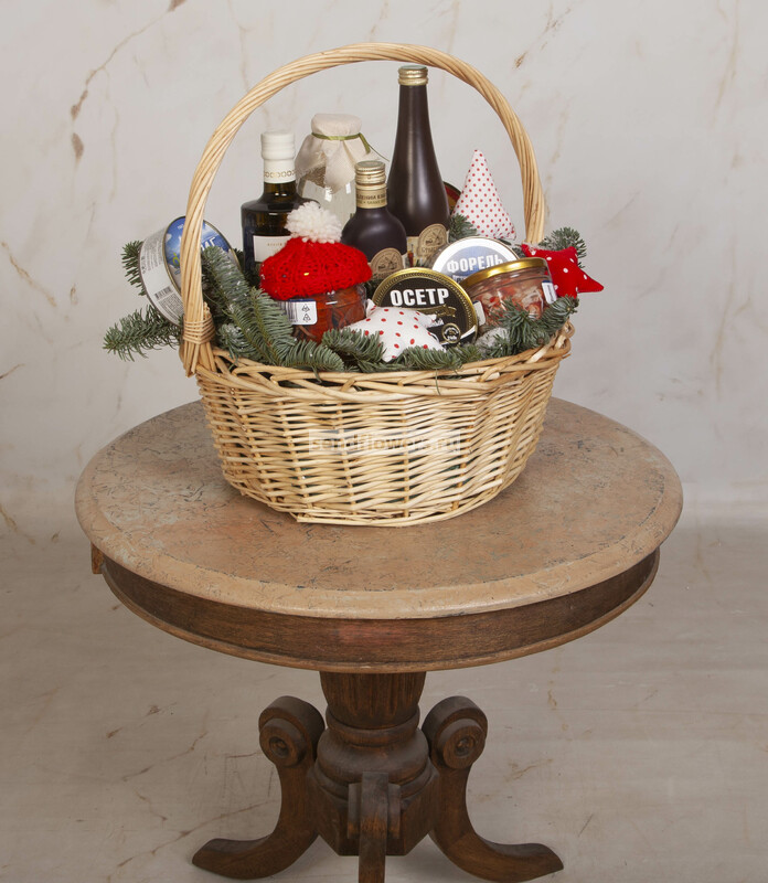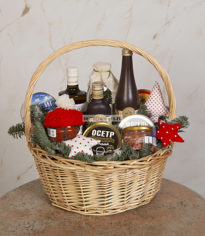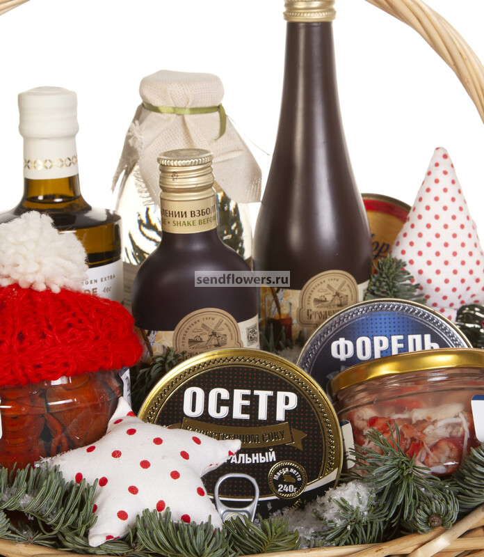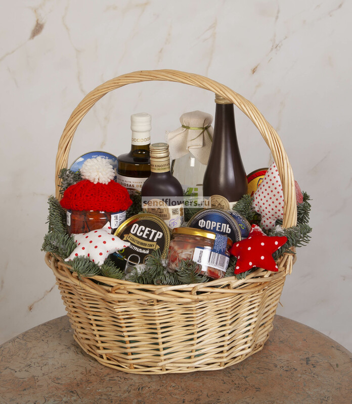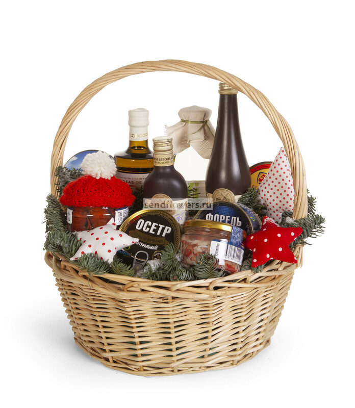 Состав: Корзина средняя (1), Оазис кирпич (4), Лапник (2), Лента натуральная (5), Снег искусственный (1), Консервы "Осётр натуральный" (1), Масло оливковое первого холодного отжима купажированное ТМ Abril Gran Selleccion, 500мл (1), Консервы из мяса краба(салатное) ст/б 200гр в солевой заливке (1), Консервы из раков волжских в солевой заливке 500гр (1), Сбитень "Столбушинский" С чабрецом 250 мл. стекло (1), Сбитень "Столбушинский" С чабрецом 500 мл. стекло (1), Консервы "Килька балтийская" (1), Консервы "Сиг в томатном соусе" (1), Консервы "Форель в собственном соку" (1), Игрушка из ткани (3), Сок березовый ст.бут (1), Вязаная шапка (красная) (1)