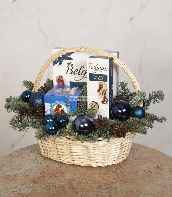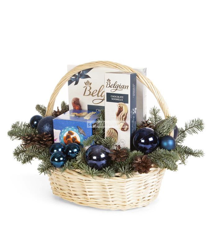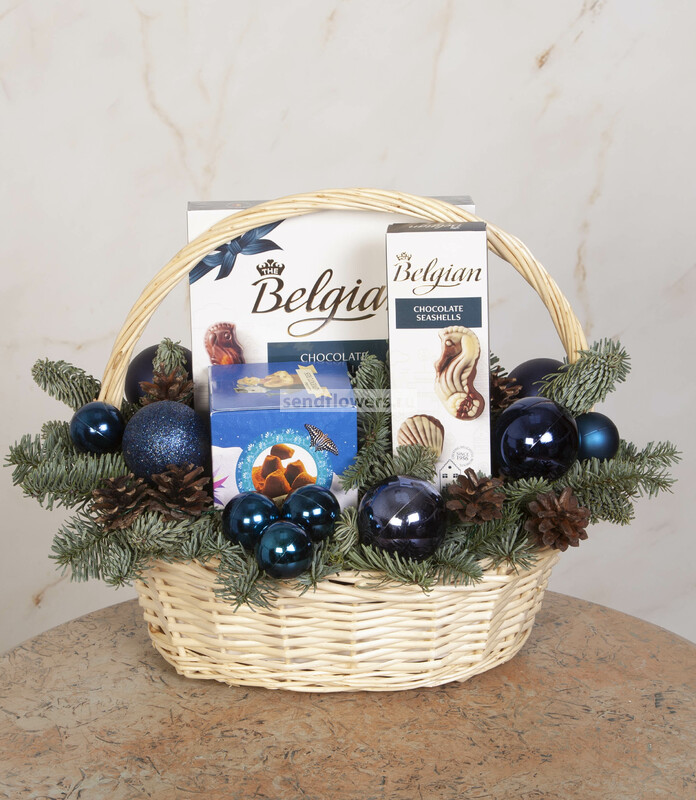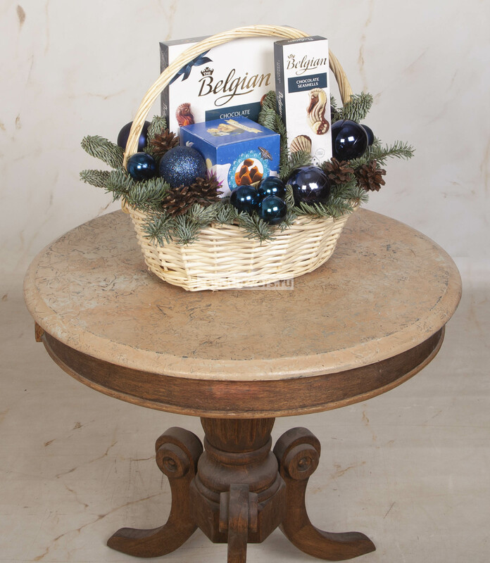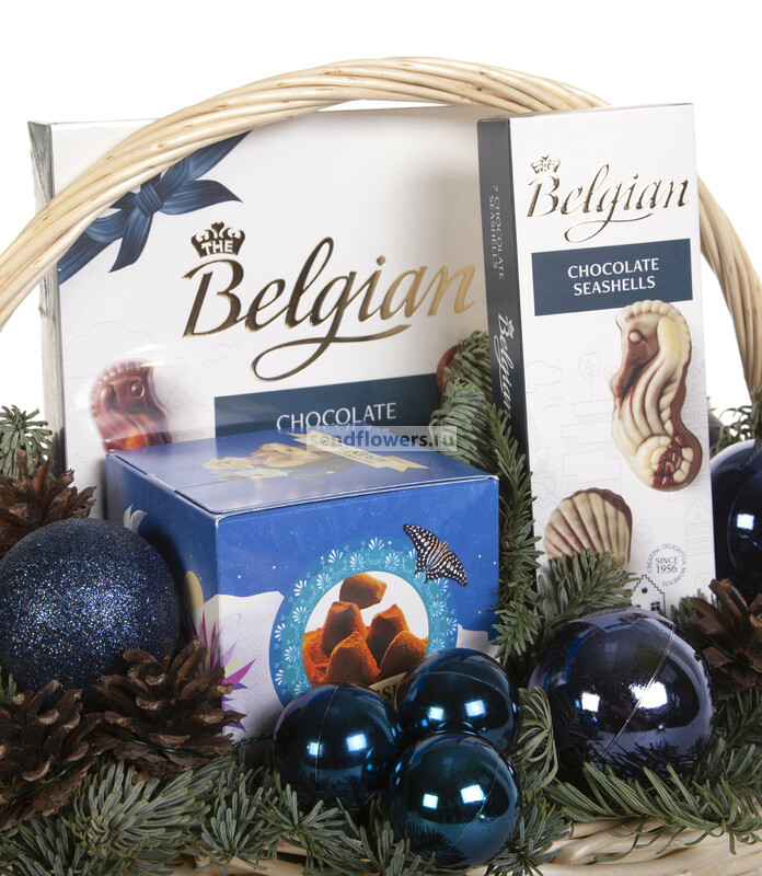 Состав: Оазис кирпич (2), Корзина малая (1), Лапник (1), Лента натуральная (5), Шар новогодний стандартный (пластик) (5), Шарики-мини (пластик) (5), Шишка натуральная (5), Бельжиан "Дары моря" синий бант 250гр (1), ФРАНЦУЗСКИЕ ТРЮФЕЛИ "BARON" классические 150гр. (1), belgian Дары Моря синий бант 65гр. (1)