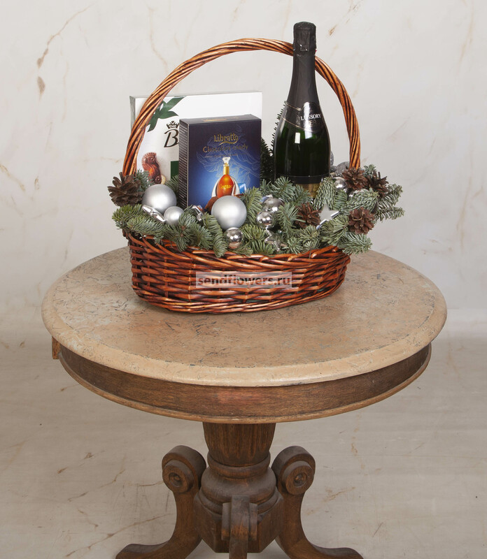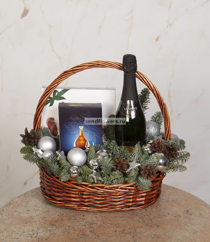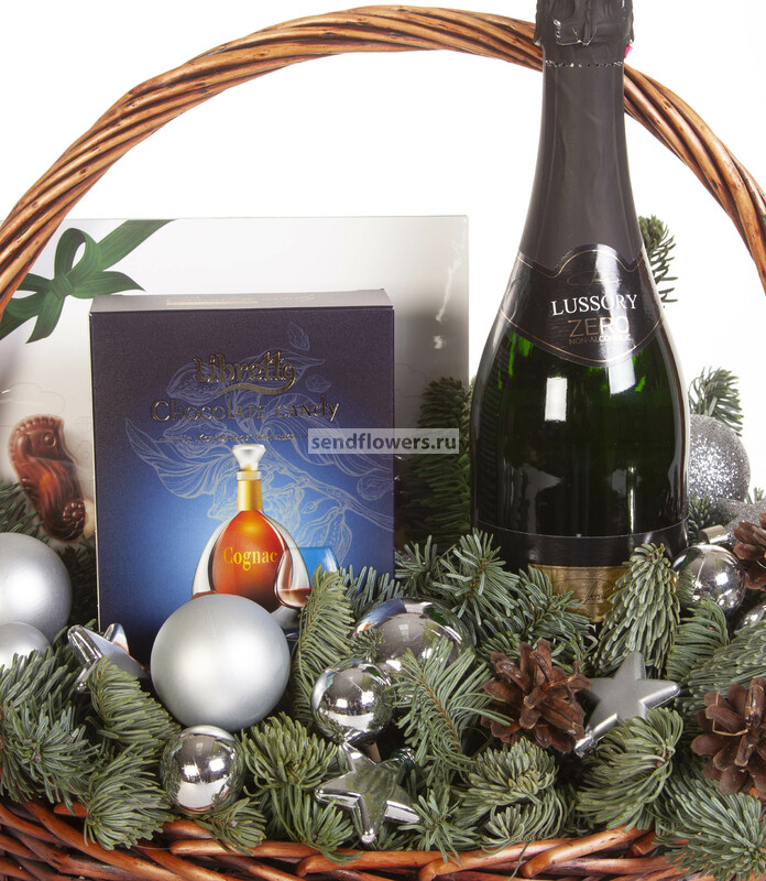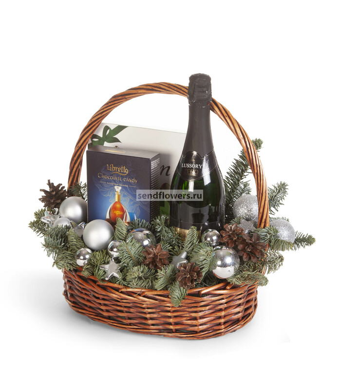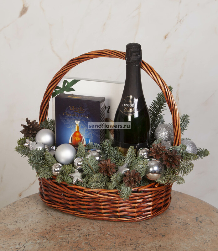 Состав: Оазис кирпич (2), Корзина малая (1), Лапник (2), Лента натуральная (5), Шар новогодний стандартный (пластик) (7), Шарики-мини (пластик) (7), Шишка натуральная (7), Бедьжиан конфеты Дары Моря зеленый бант 250 г. (1), Звезды, ёлочки декор на вставке (блест.) (7), Вино игристое безалкогольное белое, 0,75 л (1), Конфеты LIBRETTO в темном шоколаде с Коньячной начинкой 144г (1)