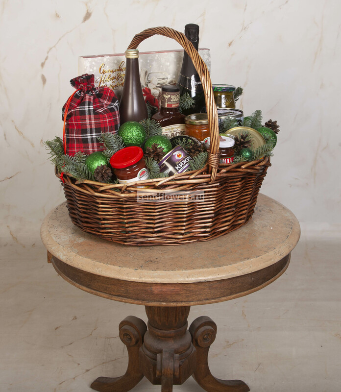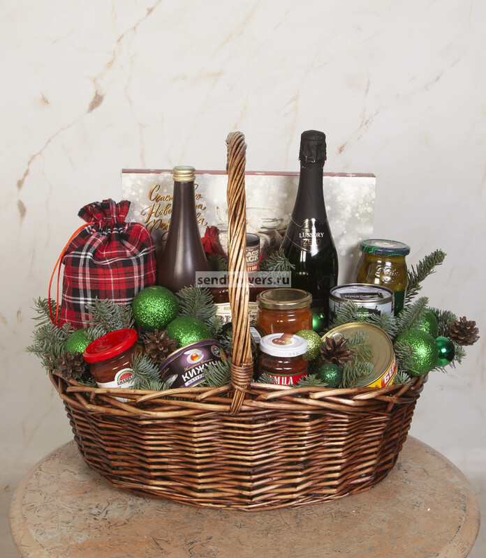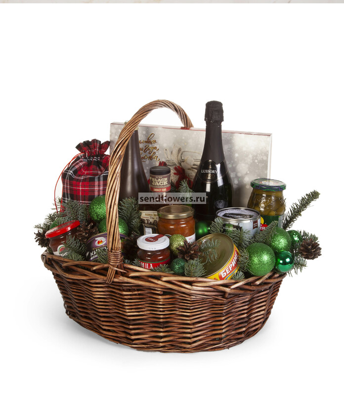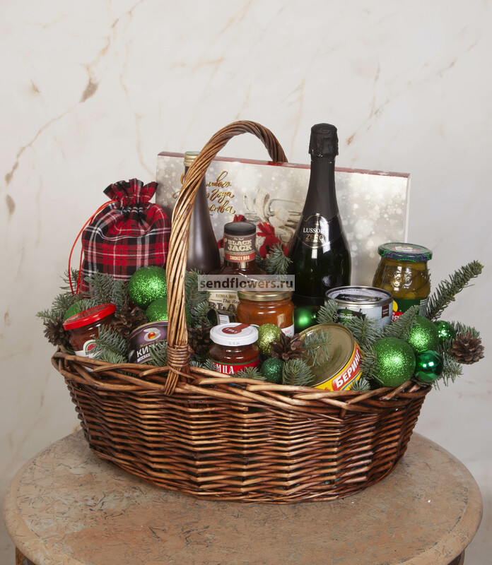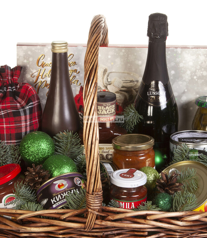 Состав: Оазис кирпич (6), Лапник (3), Мандарины (15), Лента натуральная (7), Шар новогодний стандартный (пластик) (5), Шарики-мини (пластик) (7), Шишка натуральная (7), Сайра натуральная 245гр (1), Корзина большая (1), Огурцы консервированные (1), Шпроты (1), Икра баклажанная "ARMA" (1), Конфитюр айвовый "AMARELLA" 300гр (1), Салат из морской капусты Дальневосточный 220гр (1), Аджика "ARMA" 250гр (1), Соус BBQ (1), Сбитень "Столбушинский" С чабрецом 500 мл. стекло (1), Консервы "Печень трески" (1), Консервы "Кижуч натуральный" (1), Вино игристое безалкогольное белое, 0,75 л (1), Мешок для мандаринов (1), Конфеты ШОКОЛЕДИ "Трюфельный крем" (СНЕГОВИКИ) 150 (1)