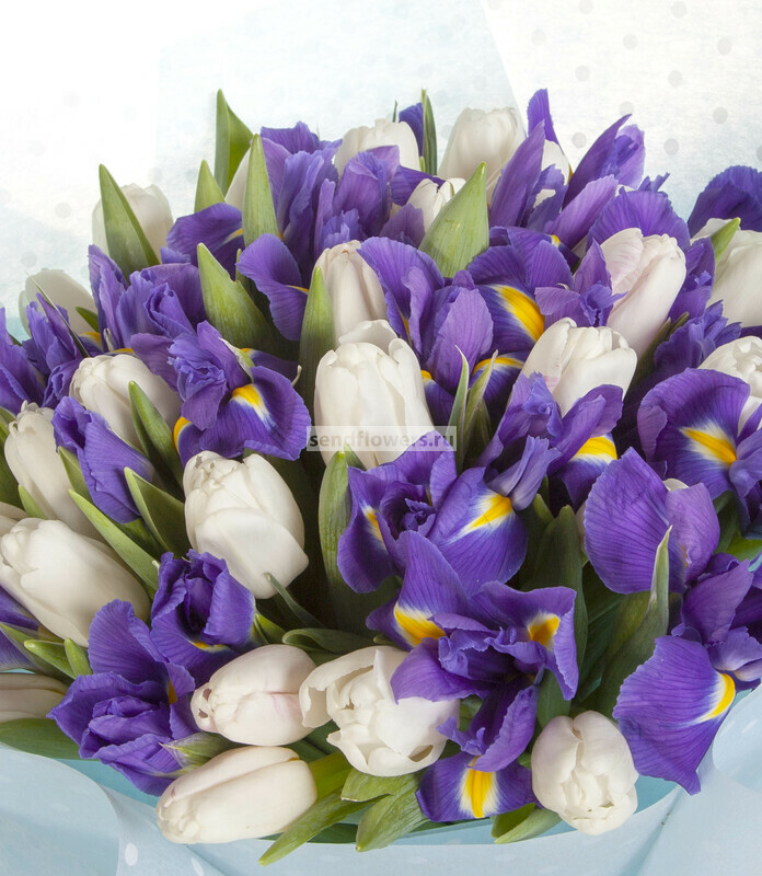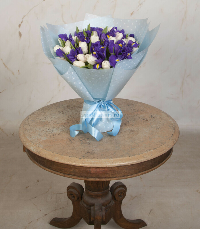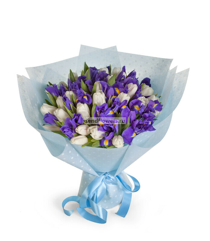 Состав: Ирис "Blue Magic" (40), Лента натуральная (6), Пленка матовая (5), Тюльпан Hakuun (35)