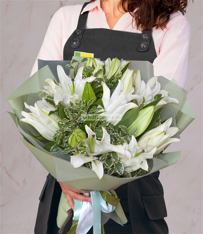 Состав: Лента натуральная (5), Лилия восточная белая (3), Фисташка (5), Пленка матовая (4)